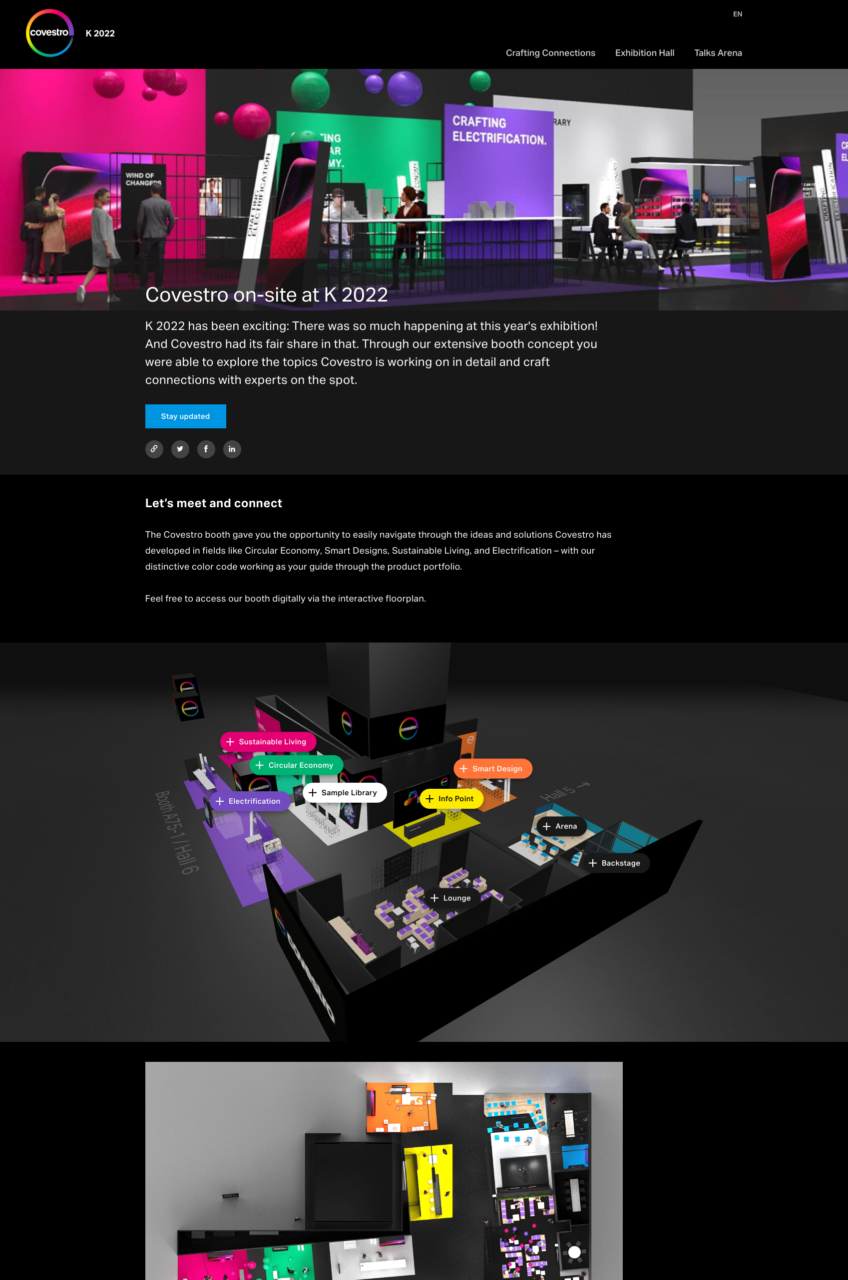 Auf der weltgrößten Kunststoffmesse K 2022 hat Covestro unter dem Motto „Crafting Connections With You“ innovative Produkte und Lösungen, die die Kreislaufwirtschaft und Klimaneutralität unterstützen vorgestellt. Die komplette Kampagne hat aus drei Komponenten bestanden – Space (digitale Veranstaltungsplattform), Stage (physischer Messeauftritt) und Meet the Innovators (begleitende Miniserie) – und schon 5 Monate vor der Messe Lust auf die Teilnahme gemacht. Im Kern hat die Kampagne die Zusammenarbeit, den Wissensaustausch und die Vernetzung auf globaler Ebene mit einer breiteren Zielgruppe gefördert. Gemeinsam mit Fork Unstable Media habe ich mich um das Konzept und die digitalen Inhalte der Komponente „Space“ gekümmert und die analoge Messewelt mit digitalen Erlebnissen verknüpft.