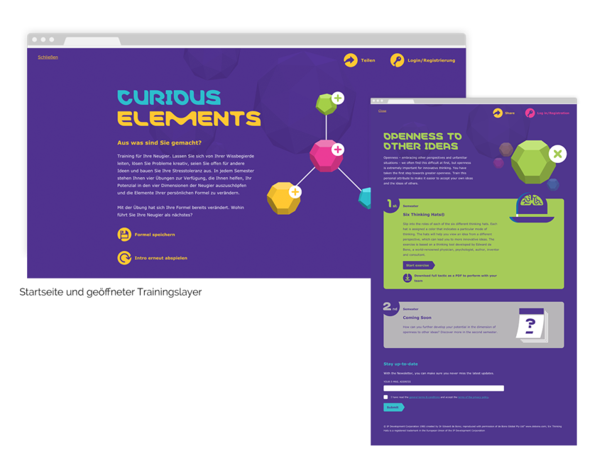 Für Merck ist Neugier die treibende Kraft von Fortschritt und Entwicklung. Ohne Neugier keine Innovation. Mit der Neugier-Initiative will das Unternehmen die Leute mit Neugier anstecken. Curious Elements ist ein wichtiger Bestandteil der globalen Initiative. Basierend auf der individuellen Neugier-Formel, die User auf dem Curiosity Hub über den Selbst-Test erhalten, können sie mit dem Curious Elements Feature ihre Formel trainieren und ihre Neugier ausbauen. Passend zu den vier Neugier-Dimensionen gibt es vier interaktive Übungen, die das Thema ganz unterschiedlich aufbereiten.