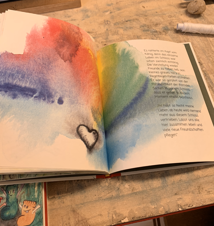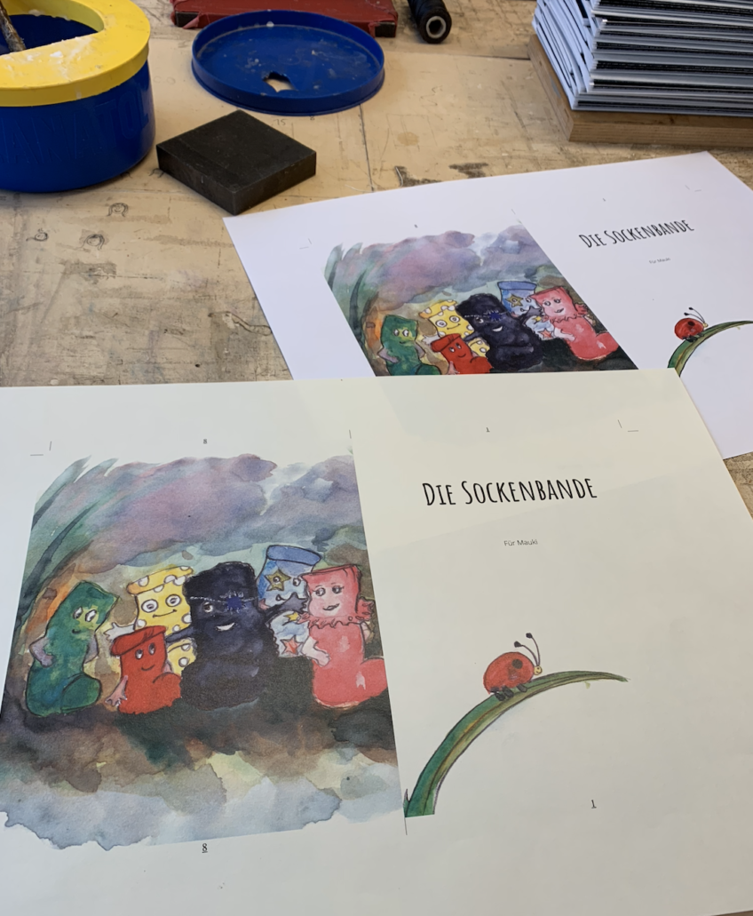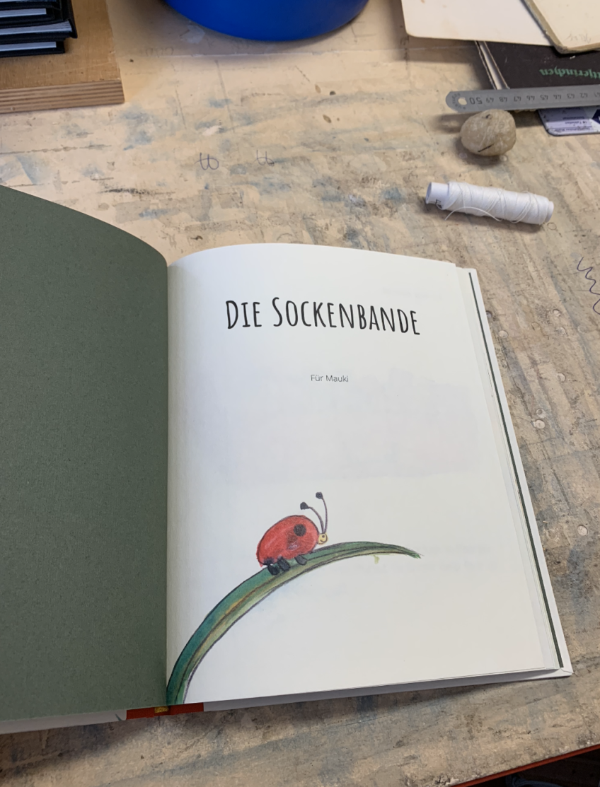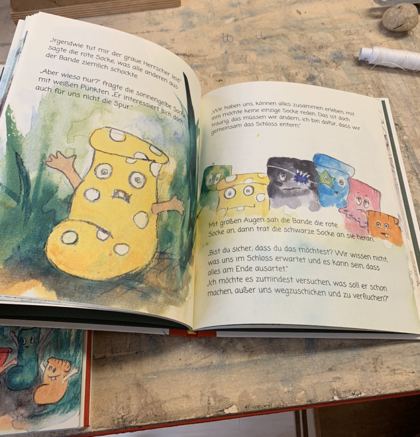 Gemeinsam mit meiner Kreativ-Partnerin in Crime Cynthia habe ich mir einen Kindheitstraum erfüllt – ein eigenes Buch schreiben. Was als Geschenkidee für unseren ganz lieben Freund Johannes zur Geburt seiner Tochter angefangen hat, ist zu einem richtigen Kinderbuch geworden. Von Cynthia kommen die Illustrationen in Aquarell-Farben und von mir die Texte in feinen Reimen. Inspiriert von dem Spitznamen „Mauki“, weil Johannes Tochter beim Ultraschall immer ihre Füße gezeigt hat, haben wir uns die Geschichte der Sockenbande ausgedacht. Dabei landet unsere Heldin – eine kleine, rote Socke – bei einem Waschgang im Sockenland und schließt sich der berüchtigten Sockenbande an. Die Geschichte handelt von Freundschaft, Vielfalt, Akzeptanz und soll vor allem Spaß machen.