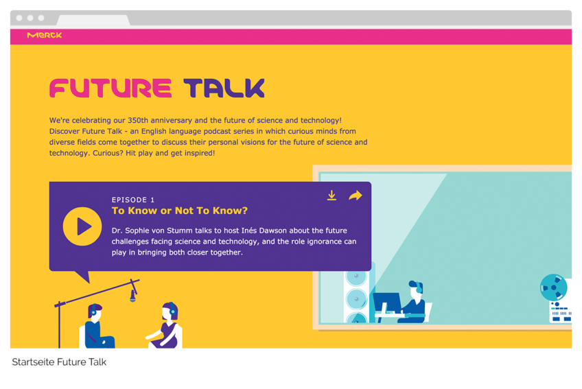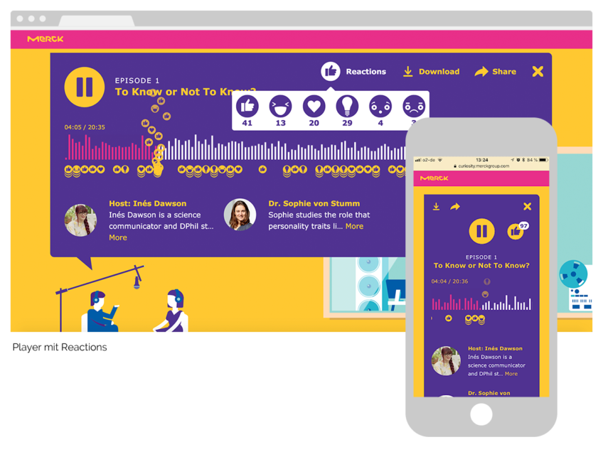 Für Merck ist Neugier der Treiber von Innovationen. Deswegen haben sie ein spezielles Gremium, bestehend aus Psychologen, Linguisten und Forschern, gegründet, das sich nur um das Thema Neugier kümmert. So auch in ihrem Jubiläumsjahr. Die Gremiumsmitglieder diskutieren in einem Podcast ihre Vision für die Zukunft von Wissenschaft und Technologie und welche Rolle Neugier dabei spielt. In den Episoden kommen Themen, wie Lebenserwartung, Innovation auf sozialer Ebene oder die Schönheit von Ignoranz auf den Tisch und werden ungewöhnlich inszeniert. Dabei können die Zuhörer:innen in Echtzeit Reactions auf das Gesagte über den Player abgeben und so ihr eigenes Bild von der Zukunft malen.