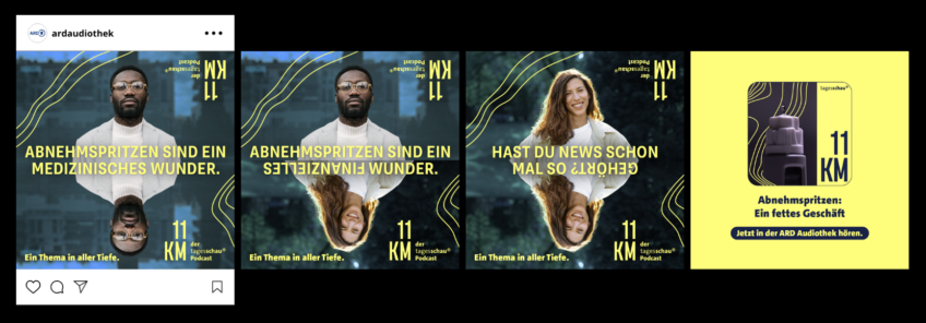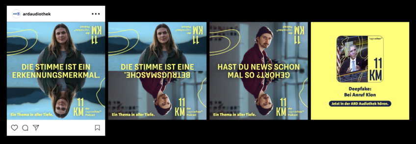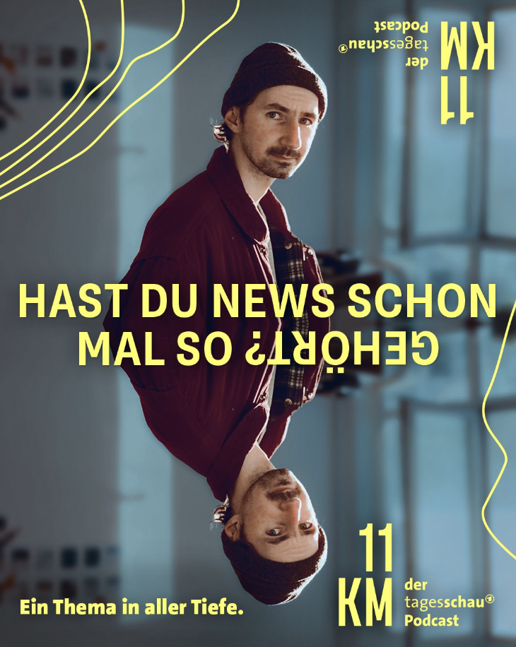 Im Podcast der tagesschau „11KM“ wird wichtigen Themen unseres Alltags auf den Grund gegangen, um unterschiedliche Perspektiven zu einem Thema umfassend zu beleuchten. Um den Podcast zu bewerben und die Idee dahinter für Social Media zu inszenieren, habe ich mir gemeinsam mit einem Team bei der Digitalagentur la red eine Kampagne überlegt, die über mehrere Dimensionen unterschiedliche Perspektiven zu einem Thema aufmacht – immer abgebunden mit dem Claim: „Hast du News schon mal so gehört?“