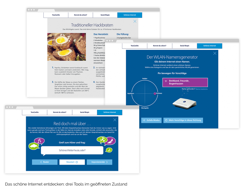 DSL-Anbieter werben immer gleich: Schneller. Größer. Günstiger. Für O2 haben wir uns bei Interone etwas Neues ausgedacht: Schönes Internet. In 4 schrägen Spots bringen die Protagonisten diesen Umstand auf den Punkt. Mit schönem Internet kann Schwiegermutters Hackbraten einpacken und der nervige Nachbar kommt endlich gut weg. Was hinter dem Lob steckt, beantworten wir auf der Kampagnenseite. Dort kann man die vielen Seiten des schönen Internets entdecken: Vom WLAN-Namensgenerator bis hin zu Hackbraten-Rezepten. Die Spots und die Microsite sind Teil einer ganzheitlichen Kampagne. Dazu zählen auch POS-Plakate, Werbemittel von groß bis klein und die Verbreitung über Social Media.